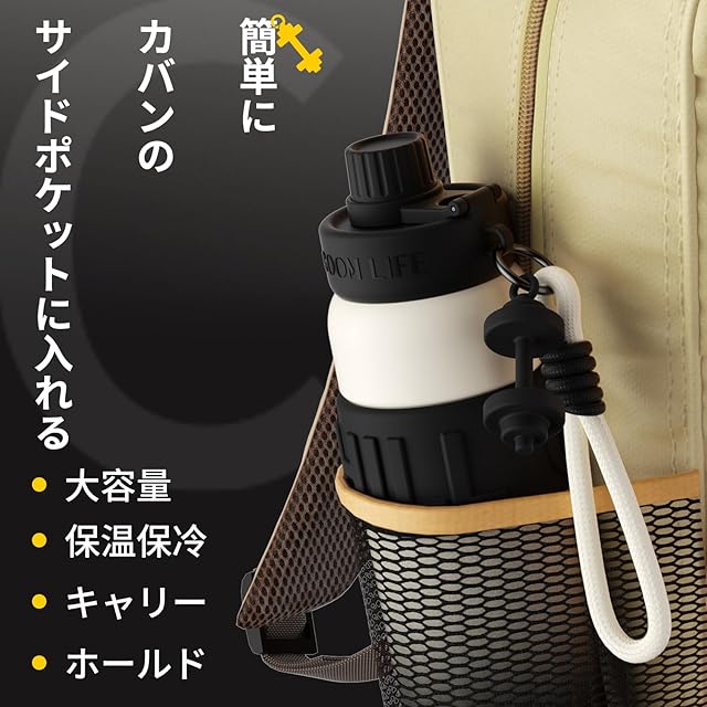 GOOM 水筒 680ml 保冷ボトル 31603 ステンレスボトル ストロー付き水筒 大容量 真空断熱 ストラップ 付き シームレス 魔法瓶 漏れ防止 洗いやすい オシャレ 携帯便利 ライトスポーツ アウトドア (ホワイト ブラック) | BASE LINE