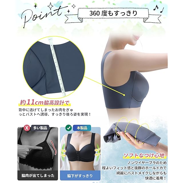 【谷間メイク・寄せブラ】ブラジャーのフロントホックをおかげで横流れをしっかりガード、脇肉、贅肉をしっかり締めてバストアップ。本来の位置に戻る、垂れた胸をグッと持ち上げてバストにサポート感倍増ブラ。ブラジャー脇高デザインで背中に逃げてしまったお肉をぎゅっぎゅっとバストへ誘導、すっきり後ろ姿を実現!気になる余分なお肉もフラットになり、食い込みにくいからタイトな服を着ても、バストラインが360度も綺麗シームレスブラです。