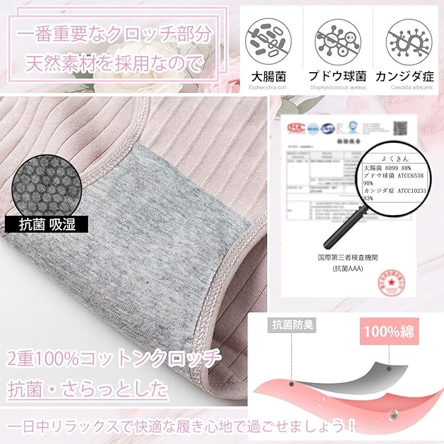 【製品仕様】素材:95%綿+5%スパンデックス。クロッチ部:100%綿、消臭、抗菌作用があります、あなたの健康をしっかりとお守りします。大切な部を守るために、2重生地を作ります。肌にやさしい快適 ショーツ レディース です。