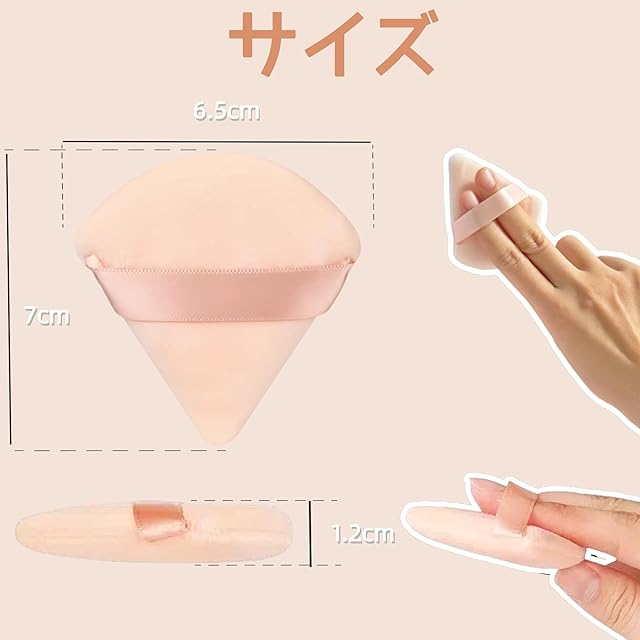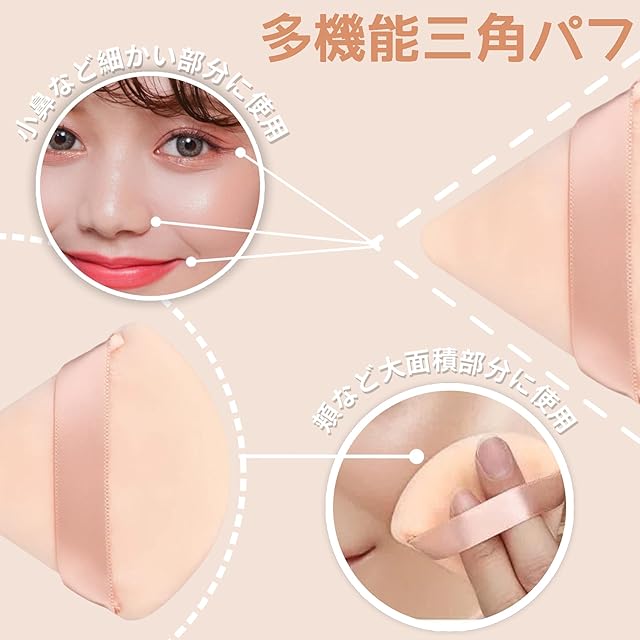 【円形と三角形を組み合わせた2-in-1パフ】パウダーパフの形状は三角形と円形なので、円形側は頬や額のメイクに適していて、三角側は小鼻やロ角の細かいメイクに適しています。