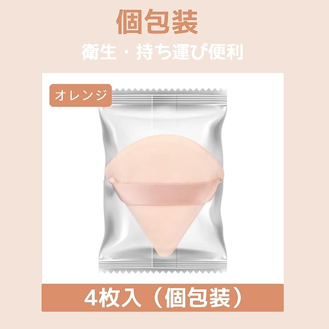 商品名:YOYOSOFT パウダーパフ 三角パフ 4個入 細かい部分に対応 幅6.5cm×長さ7cm フロッキー素材 フェイスパウダーパフ 使い捨て 大容量 パフ メイク 個包装 (オレンジ)