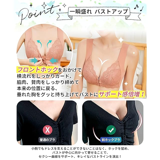 【24時間バストケア】ブラジャーはシンプルなデザインながらも繊細なレースをあしらい、大人可愛い雰囲気に。肌馴染みのよい華やかなレースが上品な胸元を演出ブラジャーです。家で着て、出勤して、运动して寝ることができます。ヨガ、ジム、スポーツ、ダンス、運動、内着あるいは外着、妊娠と哺乳期間睡眠時幅広くお使いいただけ前ホック ブラジャー。