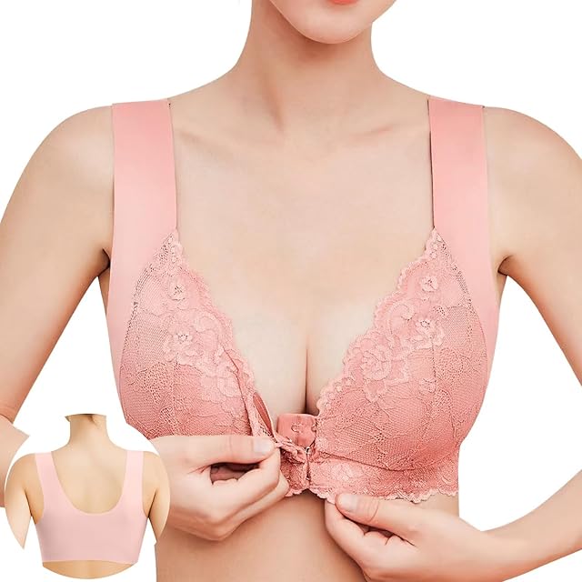 商品名:[APIKIE] ブラジャー 前ホック 【新開発前ホック・乳腺専門家監修】 3Dカップ・理想的な谷間メイク シームレス 大きいサイズ 盛れ ノンワイヤー サポート感 脇高 伸縮性 補正 レース 柔らかい 通気性 24時間 (JP, アルファベット, L, ピンク)