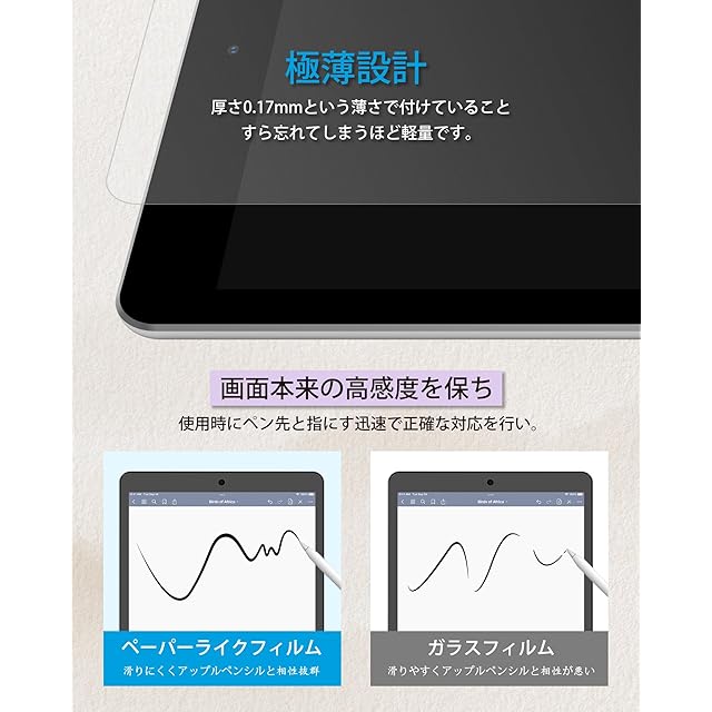 【極薄高感度】iPad 10.2 フィルムは0.17mmの厚さを採用して、高感度処理されて、元の反応感度を維持します。超薄型紙スクリーンプロテクターはガラスより、スライドせず、マットな表面でスクリーンに書いても滑りません。