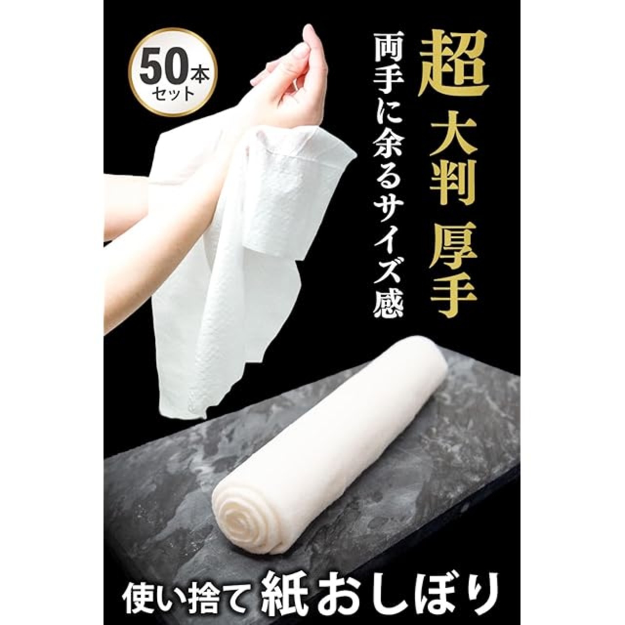 商品名:超大判 紙おしぼり 50本セット 使い捨て 丸型 厚手 上質触感 高級 温め冷やし可能 個包装 業務用