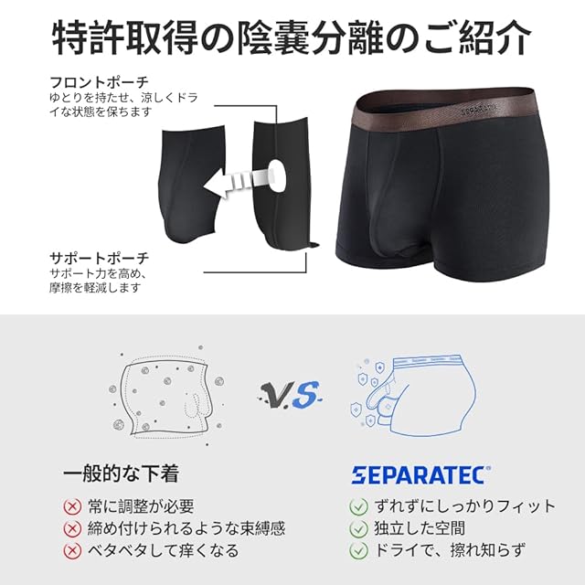 Separatecはメンズ下着の歴史に優れたイノベーションをもたらしました。Separatecはプロフェッショナル、革新的かつハイエンドのメンズアンダーウェアに焦点を当てています。 男性陰部を解剖学的に分離します。メンズアンダーウェアの各ポーチは独特なメリットをもたらすようデザインされています。 男性陰部を押しつけたり、つぶしたりすることなく、ぶら下がった状態にして、分離されたポーチに収めます。結果として、メンズアンダーウェア史上、前例のない自由な動きとサポートが得られます。 ポーチアンダーウェアは丁寧に作られているので、トイレに行ったり、快適に勃起させるなどの日常的な活動を抑えることなく、男性陰部をあるべき場所に保持できます。 前例のないセパレートポーチアンダーウェアはあなたの生活を変えます。大きなフロントポーチは快適なスペースを提供し、陰部を分離し一日中ドライに保ちます。 下側のポーチは最高のサポート力を備え、空気の流れを維持し、擦れたり、赤くなったりすることはありません。 別々のポーチの間にあるウィンドウパネルにより、陰部をを最も快適な位置に保ち、一日中ドライに保ちます。