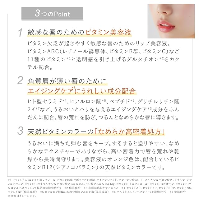 ビタミンABC(レチノール誘導体、ビタミンB群、ビタミンC)など11種*1のビタミンと、透明感を引き上げるグルタチオン*2、唇の角質層を整えるヒト型セラミド*3、ヒアルロン酸*4、ペプチド*5、唇荒れを防ぐグリチルリチン酸2K*6などの有用成分をふんだんに配合。