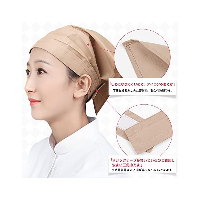 商品名:[OTAKUMARKET] 三角巾 シンプル 無地 大人用 男女兼用 カフェ 業務用 料理教室 調理実習 清掃 美容院 マジックテープ付き 簡単に取り付ける 全6色 (ベージュ, 1)