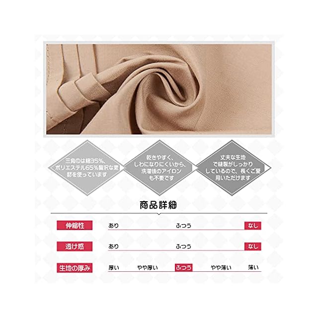 しっかり生地とこだわり縫製:丁寧な縫製と丈夫な素材で、耐久性抜群です。料理用、給食用、調理用三角巾/バンダナとして長くご愛用いただけます