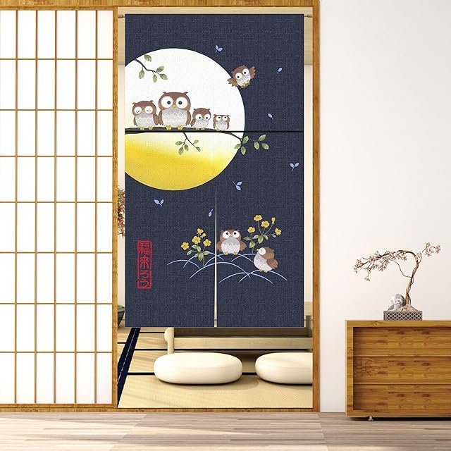 商品名:のれん 暖簾 間仕切りカーテン おしゃれ 目隠し 見えにくい 玄関 温泉 旅館 ホテル 廊下 お風呂 洗面所 トイレ オーダー可 ドアカーテン キッチ リビング 飲食店 出入り口 ふくろう(ダークブルー)幅75丈120cm