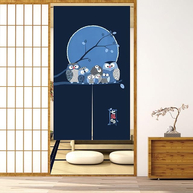 商品名:のれん 暖簾 間仕切りカーテン おしゃれ 目隠し 見えにくい 玄関 温泉 旅館 ホテル 廊下 お風呂 洗面所 トイレ オーダー可 ドアカーテン キッチ リビング 飲食店 出入り口 七福ろう(ダークブルー)幅75丈120cm