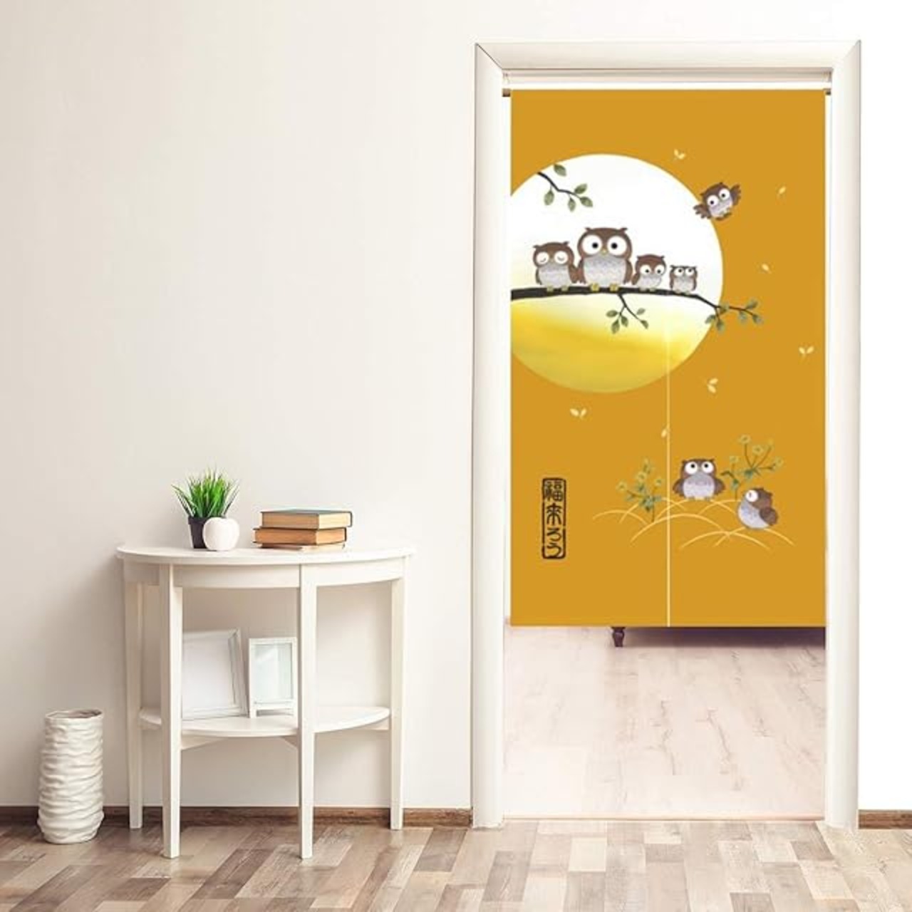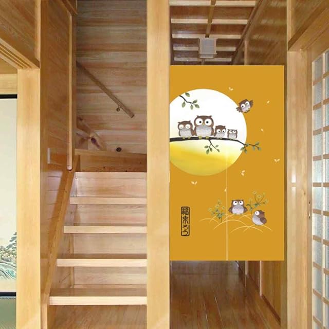 商品名:のれん 暖簾 間仕切りカーテン おしゃれ 目隠し 見えにくい 玄関 温泉 旅館 ホテル 廊下 お風呂 洗面所 トイレ オーダー可 ドアカーテン キッチ リビング 飲食店 出入り口 ふくろう(黄色い)幅85丈120cm
