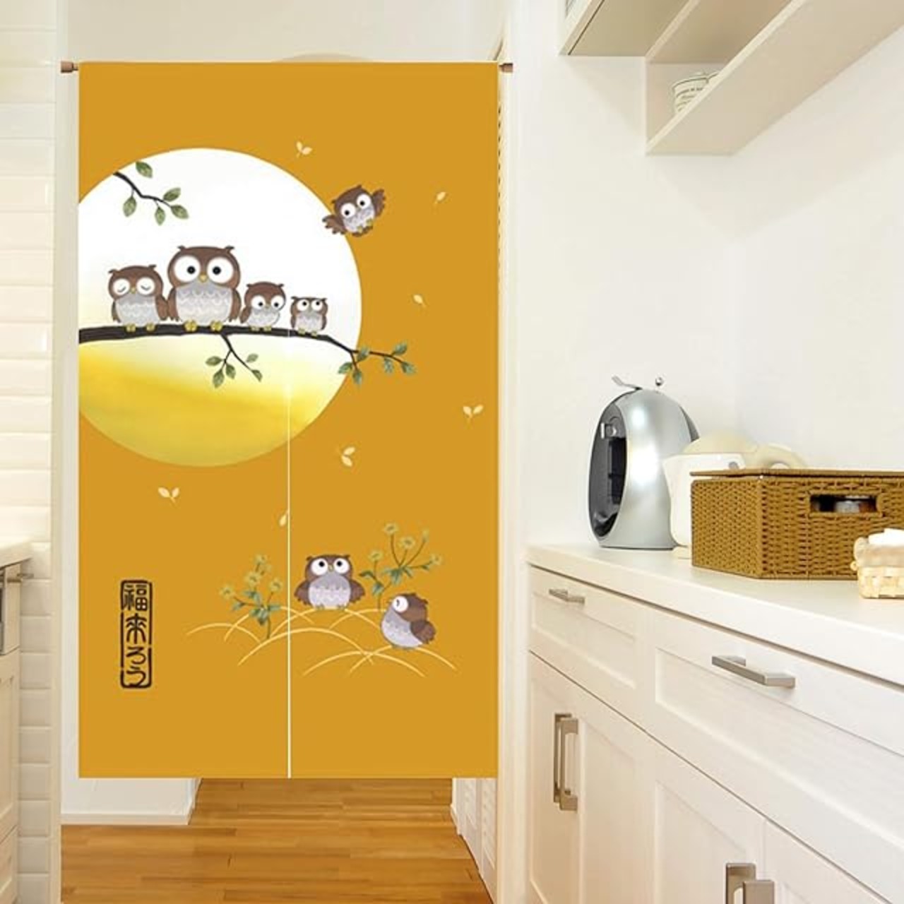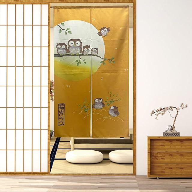 商品名:のれん 暖簾 間仕切りカーテン おしゃれ 目隠し 見えにくい 玄関 温泉 旅館 ホテル 廊下 お風呂 洗面所 トイレ オーダー可 ドアカーテン キッチ リビング 飲食店 出入り口 ふくろう(黄色い)幅75丈150cm