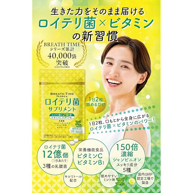 BREATH TIME(ブレスタイム)ロイテリ菌サプリメント 生きた力をそのまま届けるロイテリ菌12億個(※)×ビタミン×キシリトールの新習慣。(※)1日2粒あたり さらに乳酸菌3種、スッキリ成分5種配合でロイテリ菌を力強くアシスト。l 新感覚のお口で溶かすタイプのチュアブル錠サプリメント。