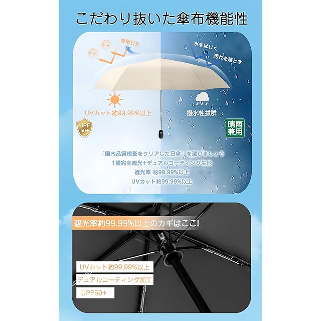 商品名:日傘 AYO 折り畳み日傘 UVカット100% 遮光 遮熱 折りたたみ傘 晴雨兼用 超軽量 ワンタッチ自動開閉 コンパクト 紫外線遮断 日焼け防止 耐風撥水 携帯便利 メンズ レディース 男女兼用 暑さ対策 父の日 母の日のプレゼント (ベージュ,傘のふさ)