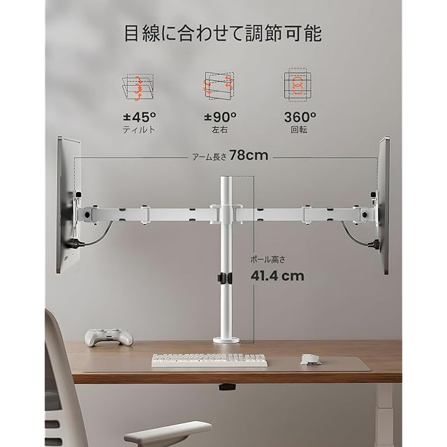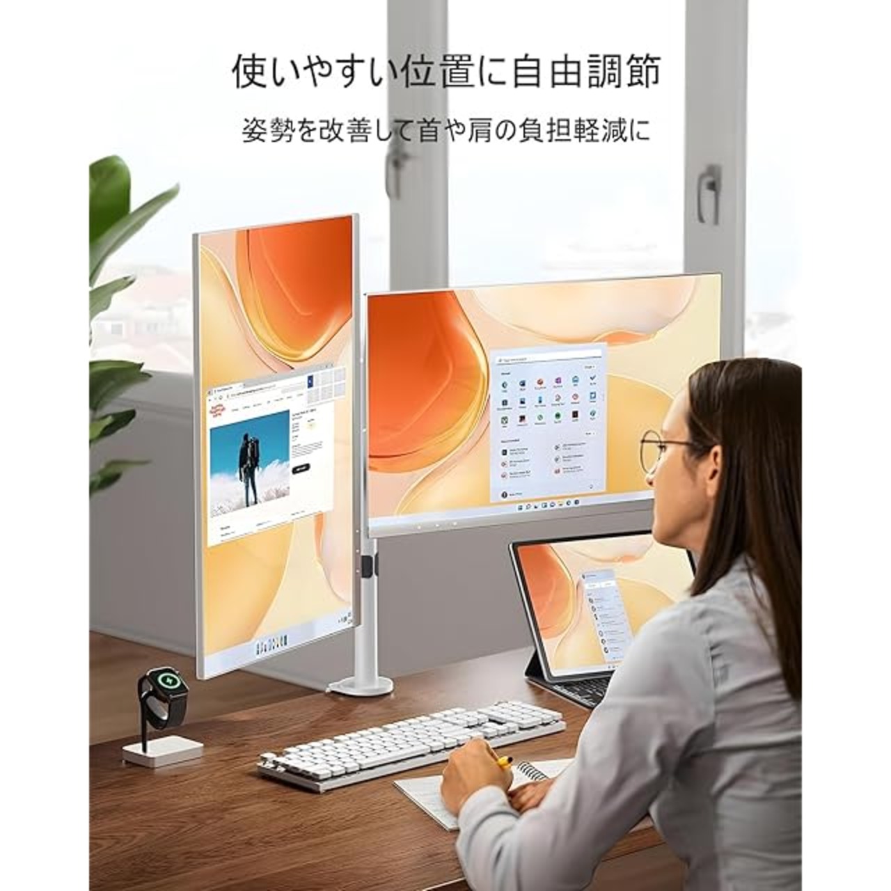 商品名:ErGear モニターアーム デュアル 2画面 ホワイト/白 13~32インチ対応 商品仕様: 対応モニター:サイズが13-32インチ、重量2~8kg以内 対応VESA規格:75x75mm、100x100mm 設置方法:クランプ式とグロメット式両方対応 ご注意:ご購入日より2年間不具合がございましたら、ご遠慮なくこちらに連絡してください