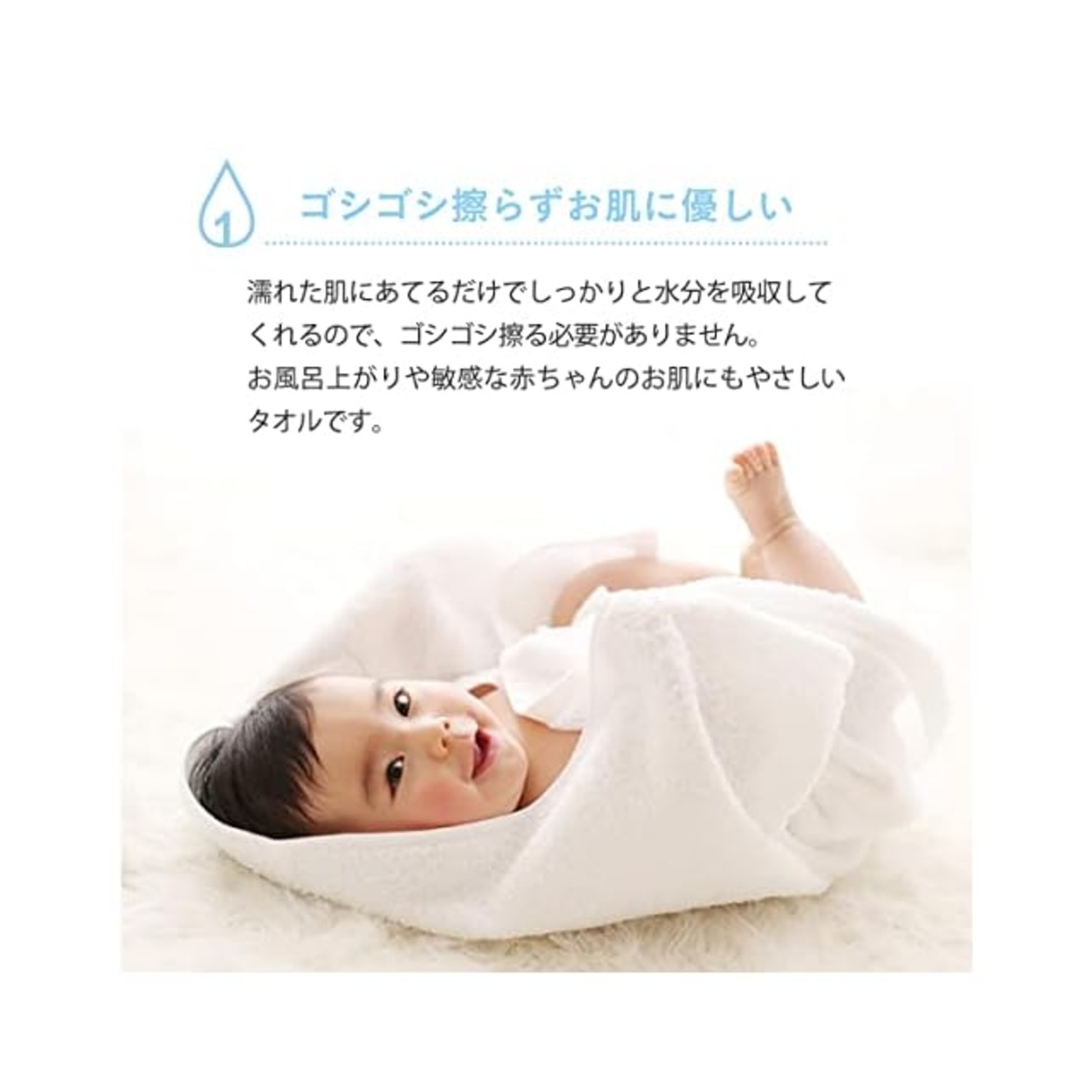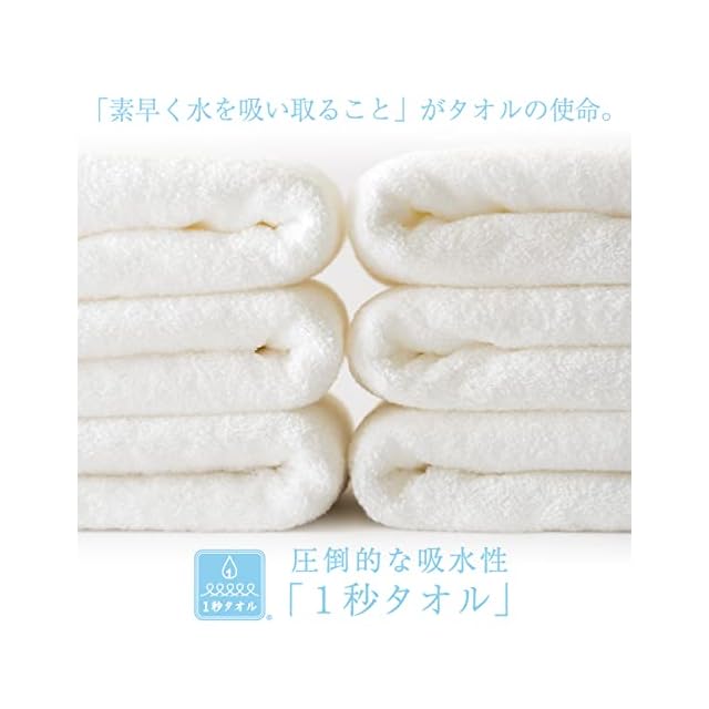 「1秒タオル」とは、タオルを1cm角に切り取った試験片を水に浮かべた時、1秒以内に沈み始めるタオルの事です。吸水性抜群の1秒タオルは押し当てるだけで瞬時に水分を吸収してくれます。お風呂上がりの敏感なお肌や髪、赤ちゃんにもやさしく快適にお使いいただけます。 ※類似品にご注意ください。 ※「1秒タオル」の認定は、ホットマン株式会社が独自の規定で行っております。(商標登録済み)