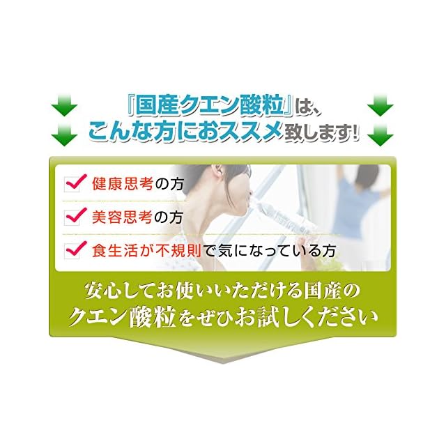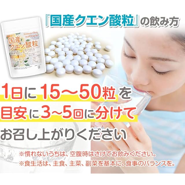 原材料名:クエン酸(国内製造)、粉末パラチニット/結晶セルロース、グリセリン脂肪酸エステル、セラック、微粒二酸化ケイ素、タルク、カルナウバロウ 内容量200g(180mg×約1100粒)1粒 国産クエン酸120mg