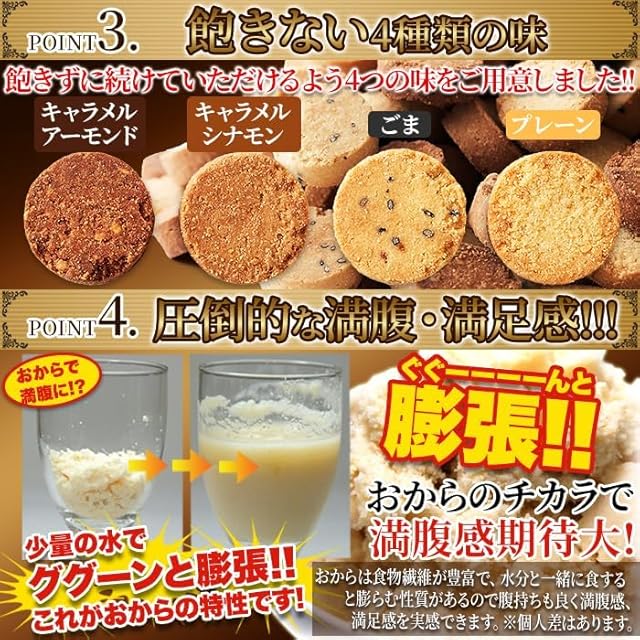 ✅【おからのチカラ】粗いおからと細かいおから粉砕した2種類の「おから」を使用しています。おからは食物繊維が豊富で、水分と一緒に食するとぐぐーんと膨らむ特質があるので腹持ちもよく満腹感・満足感を実感できます。