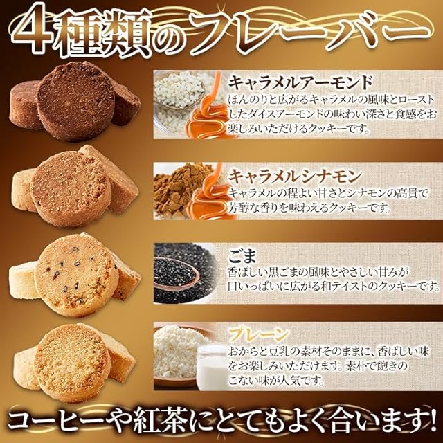 ✅【4種類のフレーバー】キャラメルとアーモンドの味わいが楽しめるキャラメルアーモンド、キャラメルの程よい甘さとシナモンの高貴で芳醇な香りを味わえるキャラメルシナモン、香ばしい黒ごまの風味とやさしい甘みのごま、おからと豆乳の素材そのままに素朴で飽きのこない味のプレーンの4つの味が楽しめます。