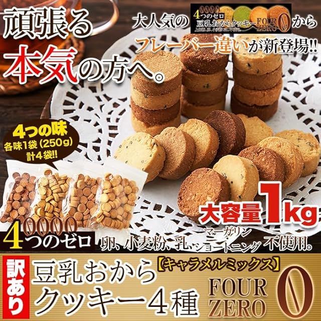 商品名:天然生活 豆乳おからクッキーFourZero 4種 キャラメルミックス (1kg) 250g×4袋 訳あり おやつ 大容量 クッキー ビスケット おから 豆乳 大豆