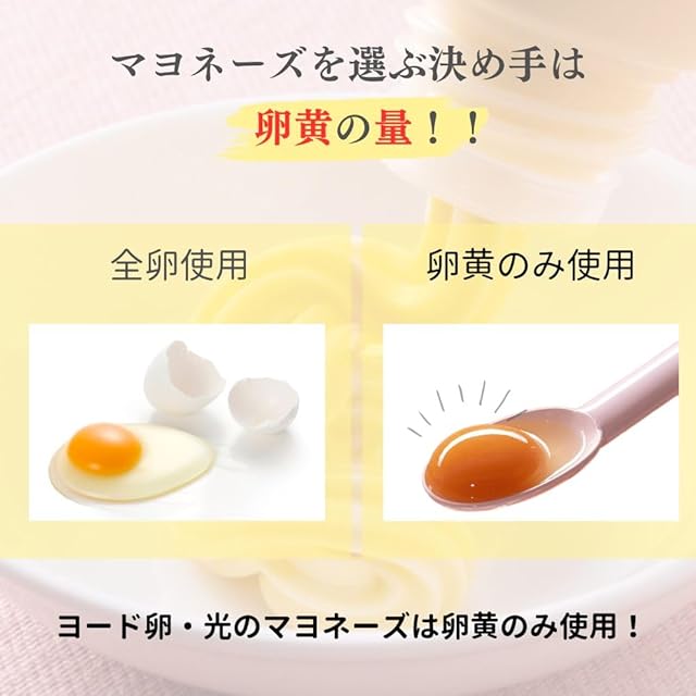 ヨード卵・光の卵黄だけをたっぷり*18%使用することで、コクのある美味しさを引き出しました。まろやかな味わいなので、いろいろな料理の素材としても使える美味しいマヨネーズです。*当社調べ