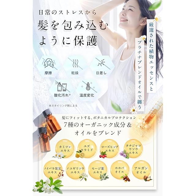 【7種の植物とユズセラミドで髪をガード】紫外線・乾燥・摩擦などの外的ストレスに着目。オーガニック植物エキスと国産ユズ由来セラミドが、髪と地肌をやさしく守りながら潤いをキープします。
